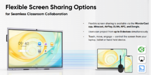 Ngoài ra còn hỗ trợ chia sẻ màn hình không dây lên đến 9 thiết bị qua nhiều giao thức như AirPlay, Miracast, NFC…, giúp nâng cao trải nghiệm cộng tác và giảng dạy trong môi trường doanh nghiệp và giáo dục.