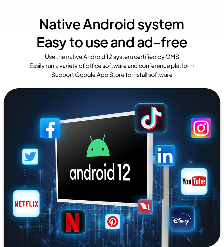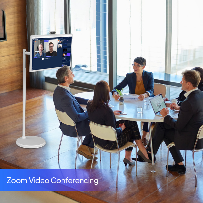 Màn hình cảm ứng có thể di chuyển inh hoạt nhờ 5 bánh xe ở dưới chân đế và có thể sử dụng 4 tiếng liên tục từ khi sạc đầy